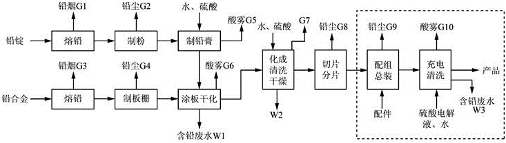 现有工程生产工艺废水经混凝沉淀处理达标后排入城市污水处理厂,地面冲洗水、职工浴室和洗衣房排水等直接排入城市污水处理厂。采用“旋风+水喷淋”或布袋除尘处理含铅废气,采用碱液喷淋洗涤处理硫酸雾。制板栅工段的铅污染物排放浓度监测结果见表3-1。