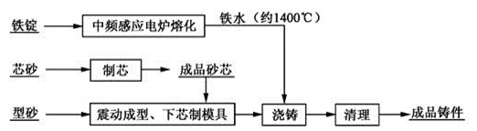 铸造车间生产工艺见图4-1。商品芯砂(含石英砂、酚醛树脂、氯化铵),以热芯盒工艺(200~300℃)生产砂芯;采用商品型砂(含膨润土、石英砂、煤粉)和砂芯经震动成型、下芯制模具,用于铁水浇铸。
