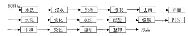 准备工段。指原料皮从浸水到浸酸之前的工序操作,其作用在于除去制革加工不需要的各种物质,使原料恢复到鲜皮状态,除去表皮层、皮下组织层、毛勒、纤维间质等物质,适度松散真皮层胶原纤维,使裸皮处于适合辑制状态。辑制工段。包括鞍制和睬后湿处理两部分。铭辄工艺一般指栋制到加油之前的工序操作,它是将裸皮变成革的过程,恪初蹂后的湿恪辑革称为湿革,需进行湿处理以增强革的粒面紧实性,提高柔软性、丰满性和弹性,并染色赋予革特殊性能。整饰工段。包括皮革的整理和涂饰,属于皮革的干操作工段,指在皮革表面施涂一层天然或合成高分子薄膜的过程,常辅以磨、抛、压、摔等机械加工,以提高革的质量。