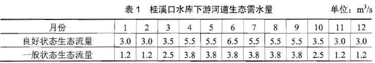 拟建坝址处多年平均径流量11.2.m3/s,工程拟按坝址多年径流量的10%泄放河道最小生态基流。坝址下游河道生态需水分析结果见表1。