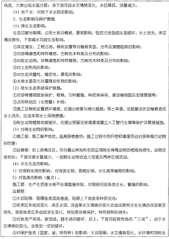 大坝建设对生态环境的影响是水利水电建设项目必须关注的重要问题,评价中必须对河流生态结构与功能有充分的调查和认识,大坝建设导致的淹没、阻隔、径流变化是对河流生态系统最大的干扰,评价中应根据《环境影响评价技术导则一生态影响》中提供的景观生态学评价方法,重点评价大坝建设对河流廊道的生态功能的影响,并要考虑河流的连续性的生态功能。 一般情况下,水利水电项目水生生态影响要分析水文情势变化造成的生境变化,对浮游植物、浮游动物、底栖生物、高等水生植物的影响,对国家和地方重点保护水生生物,以及珍稀濒危特有鱼类及渔业资源等的影响,对"三场"分布、洄游通道(包括虾、蟹)、重要经济鱼类及渔业资源等的影响。