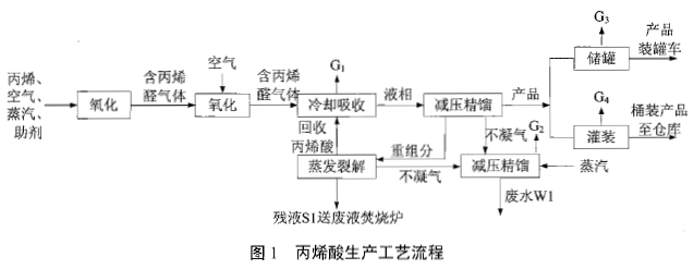 丙烯酸生产工艺见图1,主要原料为丙烯和空气,产品为丙烯酸,反应副产物主要为醋酸、甲醛)和丙烷。丙烯酸生产装置密闭,物料管道输送。