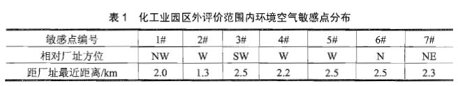 拟建厂址位于化工园区的西北部,当地冬季NW、WNW、NNW风频合计大于30%。经调查,化工园区外评价范围内有7个环境空气敏感点(见表1)。