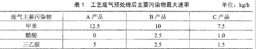 某制药企业位于工业园区,在工业园区建设初期入园,占地面积32hm。截至2012年工业园区已完成规划用地开发的80﹪。该企业拟在现有的厂区新建两个车间,生产A、B、C三种化学原料药产品。一车间独立生产A产品,二车生产B、C两种产品,B产品和C产品共用一套设备轮换生产。A、B、C三种产品生产过程中产生的工艺废气主要污染物有甲苯、醋酸、三乙胺,拟在相应的废气生产节点将废气回收预处理后混合送入RTO(热力燃烧)装置处理,处理后尾气经15m高的排气筒排放。A、B、C三种产品工艺废气预处理后的主要污染物最大速率见表1。RTO装置的设计处理效率为95﹪。