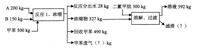 A+B=C+H2O(分子量MA=120.5,MB=90.2)根据下面的物料平衡图,计算过滤滤渣的量为____kg,甲苯废气量为____kg。(假设该反应的反应率为90%,中间产物完全溶解在二氯甲烷中,而浓缩物中其他成分均不溶于二氯甲烷。滤渣附着的溶剂量忽略)