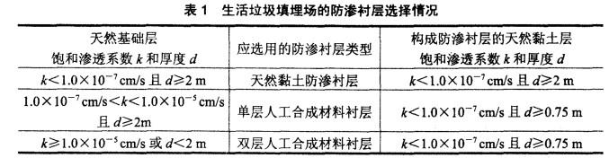 防渗衬层是指设置于填埋场底部及四周边坡的、由天然材料和(或)人工合成材料组成的防止渗漏的垫层,可分为天然黏土防渗衬层、单层人工合成材料衬层(一层人工合成材料衬层+黏土衬层或者具有同等以上隔水效力的其他材料)、双层人工合成材料防渗衬层(两层人工合成材料衬层+黏土衬层或者具有同等以上隔水效力的其他材料)。笔者将生活垃圾填埋场的防渗衬层选择情况归纳如下(表1)。