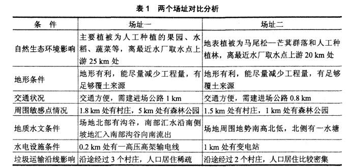 由表1可知,与场址二相比,场址一优点有:破坏人工种植的果园、蔬菜,对生态破坏相对较小;离最近水厂取水点相对较远,对水环境影响相对较小;距离电力设施比较近,距离村庄和森林公园等敏感点比较远,对周围敏感点声环境和景观等影响小。缺点:其建进场公路要长0.2km;村庄数目多,人口居住比较稀疏。综合上述两个场址的优缺点,选择场址一对周围环境的影响相对较小,更适合建设固体废物安全处置中心。