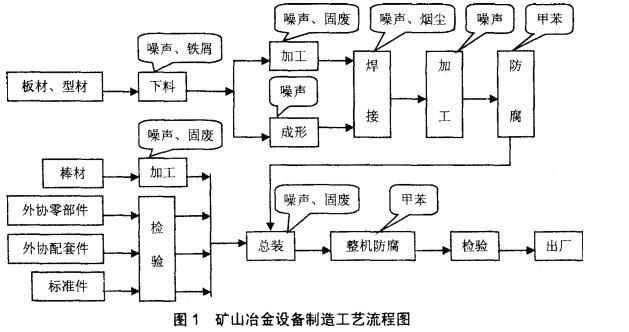 某公司决定在开发区新建矿山冶金设备制造项目,项目主要由金工车间(对铸造件进行车、钻、铣、刨)、铆焊车间(对钢板切割、焊)、装配车间(对零部件进行安装、调试)组成。矿山冶金设备制造工艺流程如图1所示: