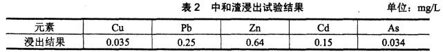 项目冶炼过程中产生水淬渣、转炉渣;污酸、酸性废水处理过程中产生含砷渣、石膏、中和渣。中和渣浸出试验结果见表2。