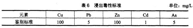 根据《危险废物鉴别标准浸出毒性鉴别》(GB5085.3—2007),重金属铜、铅等浸出标准见表6。中和渣浸出试验重金属浸出浓度均低于鉴别标准,中和渣为一般固体废物。