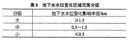 建设项目引起的地下水水位变化区域范围可用影响半径来表示,分为大、中、小三级,分级标准见表8。影响半径的确定方法可参见附录C。