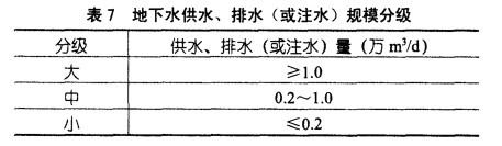 建设项目地下水供水、排水(或注水)规模按水量的多少可分为大、中、小三级,分级标准见表7。