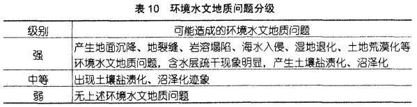 建设项目造成的环境水文地质问题包括:区域地下水水位下降产生的土地次生荒漠化、地面沉降、地裂缝、岩溶塌陷、海水入侵、湿地退化等,以及灌溉导致局部地下水位上升产生的土壤次生盐渍化、次生沼泽化等,按其影响程度大小可分为强、中等、弱三级,分级原则见表10。