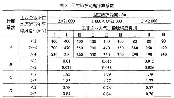 A,B,C,D——卫生防护距离计算系数,无因次,根据工业企业所在地区近五年平均风速及工业企业大气活染源构成类别从表5査取;