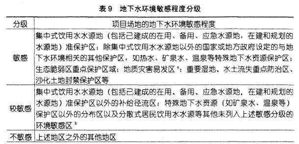 建设项目场地的地下水环境敏感程度可分为敏感、较敏感、不敏感三级,分级原则见表9。