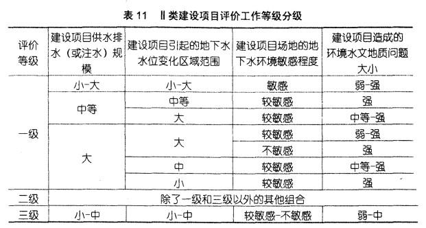 II类建设项目地下水环境影响评价工作等级的划分见表11。