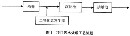 某综合性医院选址在城市中心地带,设有床位300张,设有放射科(X光机、CT机)、传染病区等23个诊疗科室,员工400人。辅助生活设施有盥洗卫生、办公室、洗衣房等。公用工程中有1台DZL2-1.25-Ⅲ型燃煤锅炉,配XZD-2型单筒旋风除尘器,烟囱高25m;1台YFL-AI型医疗废物焚烧炉,烟囱高6m。医疗废水二氧化氯处理系统一套,医院绿化面积1300m2。工程总投资预算5000万元,环保设施投资85.4万元。工程于2001年3月立项,2003年7月试运行,2003年8月进行监测验收。废水经排洪沟排入淮河干流(Ⅲ类)。项目污水处理工艺路线见图1。