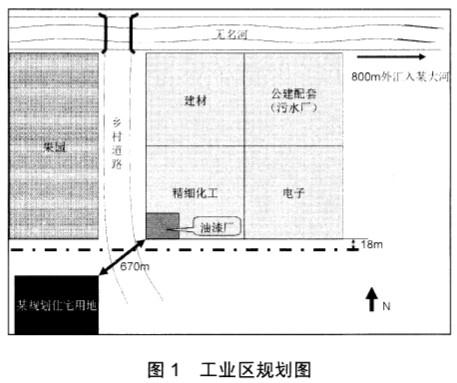 长江中下游某城市为了进一步改造遗留工业问题,决定将某大型油漆厂所在区域进行调整,全部划为工业区。该油漆厂原本为该区域唯一一家工业企业,企业废水自行处理后排入无名河(河宽25m,流量为12m3/S),周边地块原先均为农田,现状油漆厂南厂界噪声(不通过列车时)昼夜为70/58dB(A),现地方管理部门拟将油漆厂进行改造,并且将整片区域划为工业区,规划产业发展方向为精细化工、电子信息和建材。另外在区域内建设一个1.2万t/d的污水处理厂,统一处理后排入地块北侧的无名河。地块西侧为目前已有道路以及果园,地块南面为自2008年就已经通车的铁路,距离工业区边界仅为18m。地块西南面距离区域边界670m处为规划的某住宅用地,目前尚未建设(图1)。