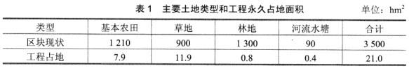 洋丰油田拟在A省B县开发建设40km2油田开发区块,计划年产原油80万t。工程拟采用注水开采的方式,管道输送原油。该区块拟建油井870口,采用丛式井。钻井废弃泥浆、钻井岩屑、钻井废水全部进入井场泥浆池自然干化,就地处理。输油管线长120km,埋地敷设方式。油田开发区块土地类型主要为林地、草地和耕地。开发区永久占地21hm2(主要土地类型及工程永久占地面积见表1),开发区内分布有若干小水塘。有条小河——白河(属地表水Ⅲ类水体,且无国家及地方保护的水生生物)流经区块内,输油管线将穿越白河,并在区块外9km处汇入中型河——荆河(属地表水Ⅲ类水体,且无国家及地方保护的水生生物),在交汇口处下游6km处进入B县集中式饮用水源地二级保护区,区块内有一处省级天然林自然保护区,面积约600hm2。工程施工不在保护区范围内,井场和管线与自然保护区边缘的最近距离为500m。