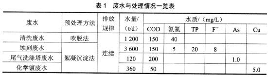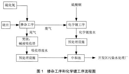 顺达公司拟在本省某开发区内建设一座电子元器件厂。该省级开发区有集中的污水处理厂和供热系统,其他环保基础设施也较完善,目前开发区污水处理厂的设计处理能力为10万m3/d,实际处理能力为6.5万m3/d。污水处理厂接管水质要求为COD350mg/L、NH3-N25mg/L、TP6mg/L,其他水质标准应当满足《污水综合排放标准》(GB8978-1996)表1及表4三级排放标准(氟化物20mg/L、总铜2.0mg/L、总砷0.5mg/L)。电子元器件生产以硅片为基材,经氨水清洗、氢氟酸或硫酸蚀刻砷化氢掺杂、硫酸铜化学镀等工序得到最终产品。其中掺杂工序和化学镀工序流程如图1所示。经过工程分析可知,拟建项目在生产过程中产生的清洗废水、蚀刻废水、尾气洗涤塔废水、化学镀废水将经过预处理后进入中和池,中和池出水排入开发区污水处理厂,废水预处理后的情况参见表1。