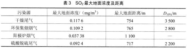 根据《大气污染物综合排放标准》( GB 16297-1996)二级标准,SO2最高允许排放浓度为960 mg/m3,排气筒高度为90 m,最高允许排放速率为130 kg/h;颗粒物最高允许排放浓度为1 20 mg/m3,排气筒高度为70 m,最高允许排放速率为77 kg/h。干燥尾气、硫酸脱硫尾气、阳极炉烟气、环保集烟烟气排放浓度和排放速率均低于《大气污染物综合排放标准》( GB 1629 7-1996)二级标准限值,其烟气均可达标排放。