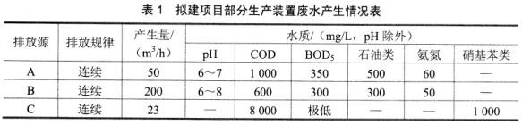 某石化企业拟建于工业区,工业区集中供水、供电,建有污水处理厂,工业区污水处理厂已建两套好氧污泥法污水处理系统,正在新建一套密改透型50m3污水生化处理系统,处理工业区各企业生产废水。废水处理达标后由同一排放管深海排放,废水排放口西北83m海域有水产养殖区,在其附近设有定期检测设备。厂区划分为石化生产装置区、中间罐区、厂内原料产品罐区、码头原料罐区、综合管理设施区和污水处理场。在污水处理厂东南角设基础防渗的露天固废临时贮存场,部分生产装置废水产生情况见表1,其中C股废水中含难生化降解的硝基苯类污染物。