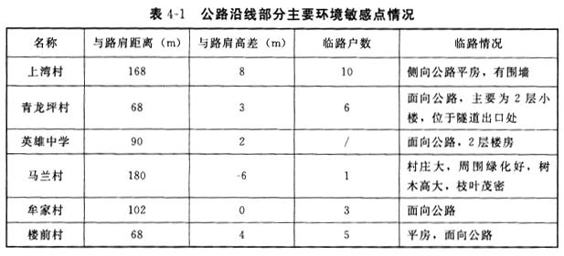 该段高速公路全长50km,设计时速80km/h,设1104m特大桥一座,中小桥若干座'特大桥桥面设排水孔;双洞单向隧道2座,单洞长3200m,互通立交1处,分离式立交1处,服务区1处,取土场8处,弃渣场20处,共征用土地206km2,公路所经地区为山岭重丘区,其中通过水土流失重点监督取得线路长度6km,通过重点治理区的线路长度5km,特大桥从A城市的集中式饮用水源二级保护区边界跨越。由于线路偏移,声环境敏感点由原来的12处变为6处,其中4处与环评审批时的情况一致,8个取土场有2个分布在水土流失重点监督区,有1个在重点治理区,弃渣场均分布在沿线的沟壑,服务区靠近一人口约2000人的村庄,设有1.5t/h燃煤热水锅炉一座,烟囱高度20m,服务区废水经化粪池处理后排放到服务区外冲沟,经过100m汇入流经该村庄的小河上游,公路沿线部分主要环境敏感点情况见表4-1。