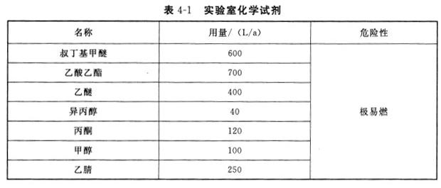 检测尿样是将某些成分从尿液中分离出来,再用仪器进行定量分析。在实验过程中,加入多种有机溶剂,样品放入烘干橱晾干,温度约60℃,采用机械排风方式。样品中的有机气体通过排气筒排入大气,有6个排气筒,一字排开,高10m,相距5m;每个排口风量4000m3/h,非甲烷总烃排放浓度为100mg/m3,风机放在屋顶。使用的化学试剂见表4-1。