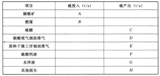 某新建铜冶炼项目采用具有国际先进水平的富氧熔炼工艺和制酸工艺。原料铜精矿含硫30%,年用量41*104t。补充燃料煤含硫0.5%,年用量1.54*104t。年工作时间7500h。