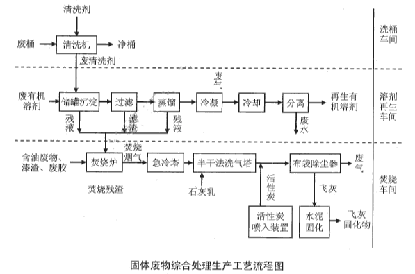洗桶车间使用清洗机洗涤废桶,清洗剂为有机溶剂(主要成分为丁醇、乙二醇、醋酸和二甲苯等),产生的废清洗剂送溶剂再生车间处理。溶剂再生车间采用蒸馏法处理废有机溶剂得到有机溶剂成品,产生的残液和滤渣送焚烧车间处理。焚烧车间采用焚烧方式处理漆渣、含油废物、废胶及溶剂再生车间产生的残液和滤渣。工程可研测算,入炉焚烧的废PVC胶约占入炉焚烧物质总量的5%。焚烧炉温度≥1100℃,焚烧残渣和飞灰固化物均送危险废物填埋场填理。废水处理站出水执行《污水综合排放标准》(GB8978-1996)三级标准。废水经处理后排至园区废水处理厂。固体废物综合处理生产工艺流程见图1-1。