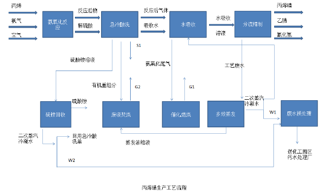 丙烯腊生产工艺见图8-1.生产原料为丙烯,氨气,空气,产品为丙烯睛,副产品为乙睛,氧化氢,硫酸镜等。