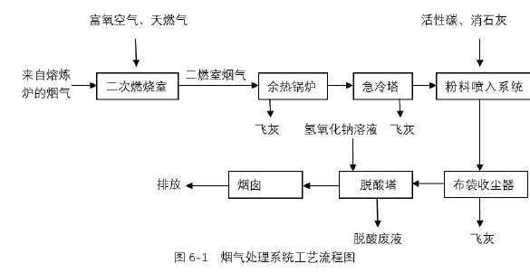 组份含量主要成分及含量金属约40%铜(20%),铝(6%),锡(4%),铁(4%),镍(2%),铅(2%),锌(1%),锑(0.4%),金(0.1%),银(0.2%),钯(0.005%)耐火材料约30%二氧化硅(16%),三氧化二铝(6%),氧化钙(6%),钛酸盐(2%)等有机物约30%聚乙烯(10%),溴化环氧树脂(溴化阻燃剂,10%),聚丙烯(5%),聚氯乙烯(2.5%),聚四氟乙烯(2.5%)等项目生产工艺为:废电路板经破碎后,与按比例配入的石英砂、焦炭等辅料通过皮带加料机加入富氧顶吹熔炼炉进行火法冶炼作业(燃料为天然气,冶炼温度≥1200℃),产出粗铜产品(含铜≥80%,富含金银等稀贵金属)。废电路板破碎和配料工序产生的粉尘,经集气罩、布袋收尘器收集后,返回熔炼系统,冶炼过程产生的冶炼渣经水淬后外售水泥厂生产矿渣水泥,产生的冶炼烟气依次经二次燃烧、余热回收、布袋收尘和脱酸等处理单元处理后达标排放。烟气处理系统工艺流程见图6-1。