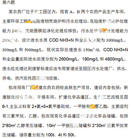 参考答案: 1、废气G1的特征污染物:三氯甲烷、一甲胺 废气G5的特征污染物:粉尘、乙醇(对粉尘纠结了很久,但看贾老师去年答的有粉尘就写了,不知道是不是又错了) 2、不合理 经深冷凝后三氯甲烷的浓度高,不适合用碳纤维吸附处理,碳纤维吸附适用于风量大、浓度低的气体的处理; 3、不可行 (1)本项目废水W1的全盐量浓度为125000mg/l,大于厂区污水处理站全盐量进水浓度5000mg/l的要求; (2)将本项目混合后进入污水处理站也不符合废水“分质分类”处理的要求,由于项目W1、W2、W3水质相差大,应将W1处理达厂区污水处理站进水浓度要求后方能进入,W2、W3可不处理直接进入; 4、(1)本项目固体废物的种类、成分、数量; (2)焚烧炉焚烧的技术指标可行性; (3)焚烧炉焚烧尾气净化措施的可行性; (4)焚烧炉剩余处理能力的可行性。