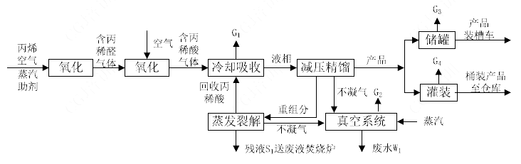 某公司拟在化工园区新建丙烯酸生产项目,建设内容包括丙烯酸生产线产线、灌装生产线等主体工程;丙烯罐〈压力罐〉、丙烯酸成品罐、原料和桶装产品仓库等储运工程:水、电、汽、循环水等公用工程:以及废气催化氧化装置、废液焚烧炉、污水处理站(敞开式)、事故火炬、固废暂存点、消防废水收集池等环保设施。丙稀酸生产工艺见图,主要原料为丙烯和空气,产品为丙烯酸,反应副产物主要为醋酸、甲醒和丙烧。丙烯酸生产装置密闭,物料管道输送。