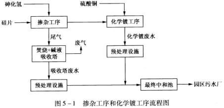 某公司拟在工业园区建设一电子元器件生产企业A厂。电子元器件生产以硅片为基材,经氨水清洗,氢氟酸/硫酸蚀刻、砷化氢掺杂、硫酸铜化学镀等工序得到产品。其中掺杂工序和化学镀工序流程见图5-1。