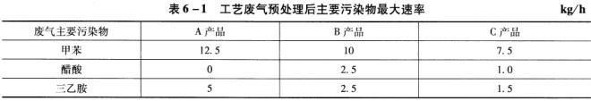 当A、B、C三种产品工艺同时运行时,甲苯排放速率最大,排放速率为:(12.5+10+7.5)*(1 -95%)=1.5 kg/h。