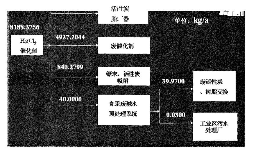 1.见下图。其中,含汞废碱水含汞为:2.5×2.O×10-3× 8000 = 4.0 (kg/a)。