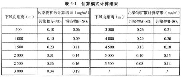 燃煤来源和成分与现有机组相同。扩建工程小时燃煤量480t,吨煤燃烧产生烟气量6500Nm3,新建机组供水水源为纳河。烟囱出口SO2排放浓度100mg/Nm3,NOχ排放浓度168mg/Nm3。经估算,新建工程的SO2、NO2小时地面浓度和距离列于表6-1中。距离烟囱30km有一国家自然保护区。