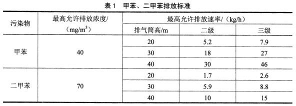 3.根据题中计算得出排气筒外排甲苯和二甲苯量分别为9.3 t/a和39.4 t/a,按照年工作300天,即工作7 200 h,甲苯和二甲苯小时排放速率分别为1.29 kg/h和5.47 kg/h,按照小时外排废气总量30万m3合计,甲苯和二甲苯排放浓度分别为4.3 mg/m3和18.23 mg/m3。按照标准环境功能区划,该区域执行《大气污染物综合排放标准》二级标准,按照标准中内插法计算,28 m高排气筒甲苯应执行的二级排放速率为5.2+(18-5.2)*(28-20)/(30-20)=15.44 kg/h,二甲苯应执行的二级排放速率为1.7+ (5.9-1.7)*(28-20)/(30-20)=5.06 kg/h。以上计算的排放浓度和标准对比,均满足标准要求;排放速率与计算的28 m高排气筒排放速率对比,甲苯排放速率满足标准要求,二甲苯排放速率不满足标准要求。因此,环评建议应当增加排气筒高度,至少加高至20+( 5.47-1.7)*(30-20)/( 5.9-1.7)= 28.98 m≈29 m 。