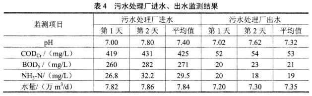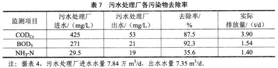 2.根据表4计算各污染物项目的去除率(除pH外),并根据出水量和进水、出水水质平均值计算各污染物的排放量,以此计算CODCr和氨氮排放总量。