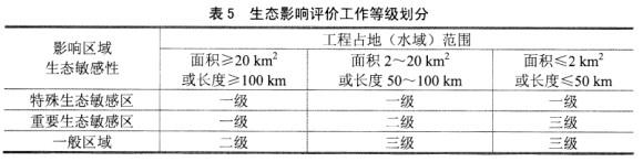 4.依据影响区域的生态敏感性和评价项目的工程占地(含水域)范围,包括永久占地和临时占地,生态影响评价等级分为三级。本工程位于一般区域,工程占地面积在2 km2和20 km2之间,根据导则中生态影响评价工作等级划分表(表5),本工程生态影响评价工作等级初步定为三级。