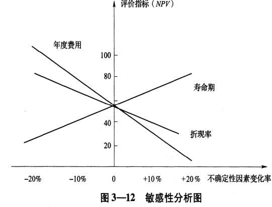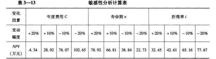 设各因素变化均按±10%、±20%变动,可得计算结果见表 3-13,并可绘制敏感性分析图如图3-12 所示。由图表可知,净现值对三个主要因素的敏感性排序为:年度费用>寿命期>折现率 b.临界点的计算。