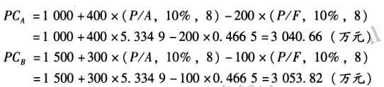 某设备工程在进行工艺管道设计时提出两种方案。A方案的投资额为1000万元,年运行成本为400万元,预计残值为200万元;B方案的投资额为1500万元,年运行成本为300万元,预计残值为100万元。两种设计方案下,设备工程的寿命期相同,均为8年,项目的基准收益率为10%。