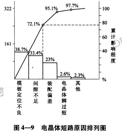 绘制排列图如下: 由上图可看出,模板定位不良和间隙不足以及装配偏差是影响电晶体短路的主要原因。管理人员应该重点考虑这三大因素,使人力、物资资源得到最大的利用。