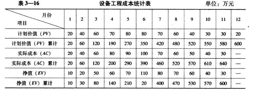 成本绩效指数CPI=EV/AC某设备工程计划成本600万元,工期12个月。根据工程施工的实际进度和成本完成情况,统计得出的设备工程成本有关数据见表3-16。