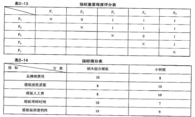 承包商B在某高层住宅楼的现浇楼板施工中,拟采用钢木组合模板体系或小钢模体系施工方案。经有关专家讨论,决定从模板总摊销费用(F1)、楼板浇筑质量(F2)、模板人工费(F3)、模板周转时间(F4)、模板装拆便利性(Fs)等五个技术经济指标对该两个方案进行评价,并采用0-1评分法对各技术经济指标的重要程度进行评分,其部分结果见表2-13,两方案各技术经济指标的得分见表2-14。