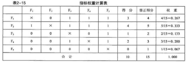 根据0-1评分法的计分办法,两指标(或功能)相比较时,较重要的指标得1分,另一较不重要的指标得0分。例如,在表2-13中,F1相对于F2较不重要,故得0给出),而F2相对于F1较重要,故应得1分(未给出)。各技术经济指标得分和权算结果见表2-15。
