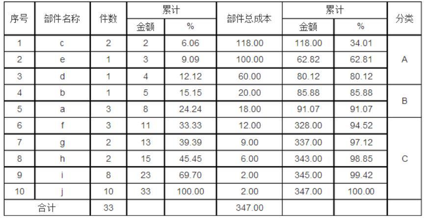 产品部件成本分配比重从表及图中可以看出,c、e、b 部件作为价值工程的分析对象。