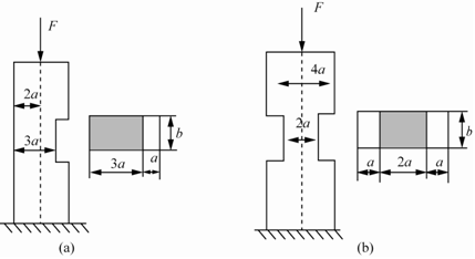 图示矩形截面受压杆,杆的中间段右侧有一槽,如图(a)所示。若在杆的左侧,即槽的对称位置也挖出同样的槽(如图(b)),则图(b)杆的最大压应力是图(a)最大压应力的( )。