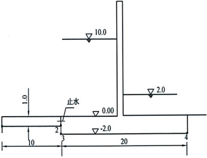 某水闸建在岩基上,共8孔,每孔净宽10m,两孔一联浮筏式,每联底宽25m,闸室顺水流长20m,闸前钢筋混凝土铺盖长10m,厚1.0m,止水设在板厚中间。闸室底板顶高程0.00m,厚2.0m,上游水位10.0m,下游水位2.0m。 题图 岩基上的某水闸剖面图 下列哪个选项最接近单联闸室总水平推力值( )
